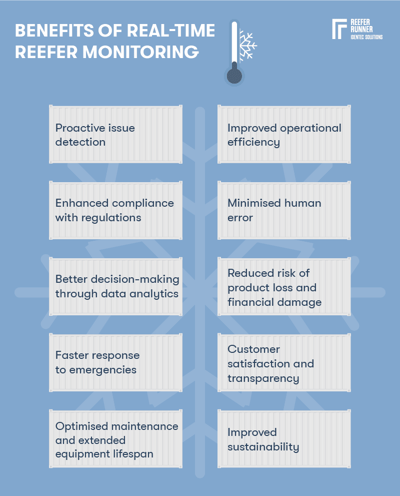 One key benefit of using real-time data for reefer container temperature monitoring is that it enables businesses to respond quickly to changes in conditions. For example, suppose there is a sudden drop in temperature or an unexpected rise. In that case, businesses can take immediate action to adjust the environment within their reefers and preserve the quality of their products - thanks to remote monitoring. Additionally, this information can help businesses assess their energy use more accurately and make adjustments to their reefers as needed. Overall, this helps businesses avoid costly product losses and keep their refrigeration units running at peak efficiency.