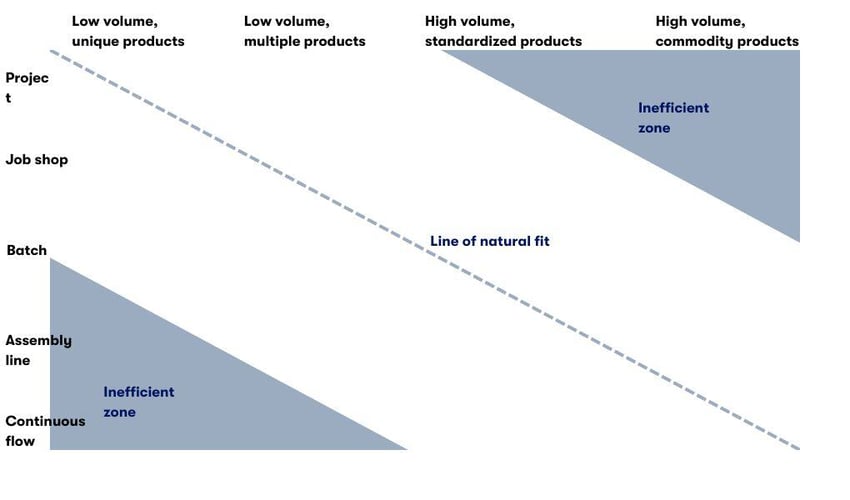 Robert H. Hayes and Steven C. Wheelwright introduced a manufacturing process classification system that distinguishes between process types and product types. (1) The core idea behind the Hayes and Wheelwright matrix is that the chosen process must align with the product's characteristics. A significant point emphasized by this model is that efficiency can be enhanced by moving rightward and downward within the product-process matrix. However, this movement should not compromise effectiveness. The matrix also highlights that certain process designs naturally align with specific product characteristics, which is illustrated by the diagonal "line of natural fit." Moreover, it suggests that shifting processes towards the lower right can increase productivity.