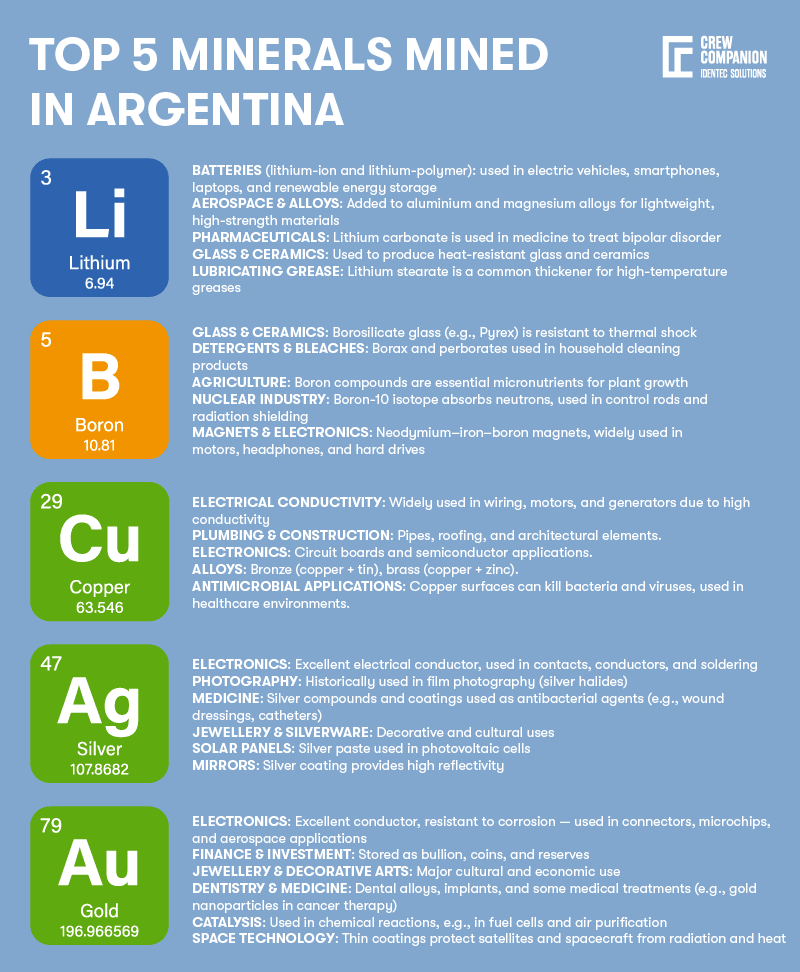 Argentina's top five mined minerals are gold, silver, lithium, copper, and boron. Gold and silver account for the majority of mining export value, especially from provinces like Santa Cruz and San Juan. Lithium, extracted mainly from brine deposits in the northwest (Jujuy, Salta, Catamarca), is rapidly growing in importance due to global demand for batteries. Copper is an emerging focus, with major projects underway in San Juan and Salta. Industrial minerals like boron are also exported, though on a smaller scale.